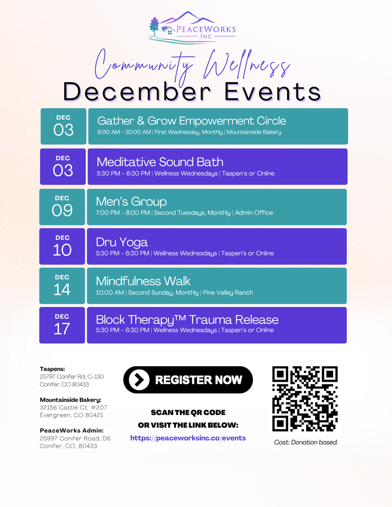 Schedule for PeaceWorks Wellness Program. Classes are in our studio and we will be donating all the proceeds to our local PeaceWorks non-profit.